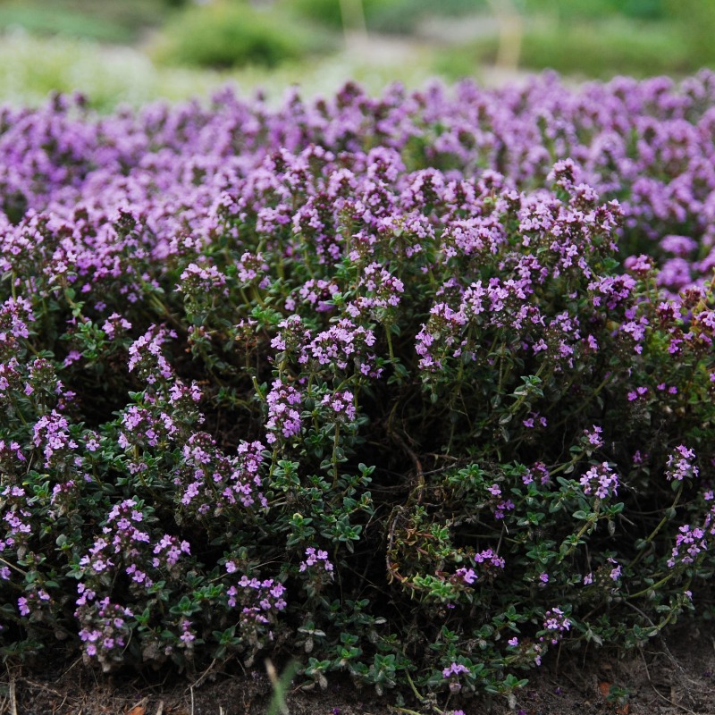 Многолетний полукустарник с деревянистым стеблем и травянистыми ползучими побегами, высотой до 10-20 см. Листья жёсткие, округлые, яйцевидные, продолговатые. Цветки мелкие, собраны в шаровидные, головчатые соцветия, розово-лиловые. В течение 3-5 лет образует плотный сплошной «ковёр», в период цветения яркий розово-лиловый. Тимьян издревле почитался божественной травой, способной возвращать человеку здоровье и жизнь. Отвары и настои тимьяна губительно действуют на патогенные грибы и микробы, устойчивые к антибиотикам, усиливают выделение желудочного сока, улучшают пищеварение, нормализуют микрофлору кишечника, стимулируют обмен веществ, кровообращение, укрепляют иммунитет. Их применяют при инфекционных заболеваниях верхних дыхательных путей, мочеполовой системы, желудочно-кишечного тракта, при воспалении ротовой полости, наружно при радикулите, ревматизме, болях в суставах, гноящихся ранах, фурункулах, кожных сыпях, грибковых заболеваниях кожи, от перхоти, для укрепления волос и восстановления структуры ногтей. В пищу употребляют молодые нежные побеги с листьями в свежем и сухом виде, в качестве приправы практически ко всем блюдам, при консервировании и мариновании овощей, для ароматизации соусов и уксуса.