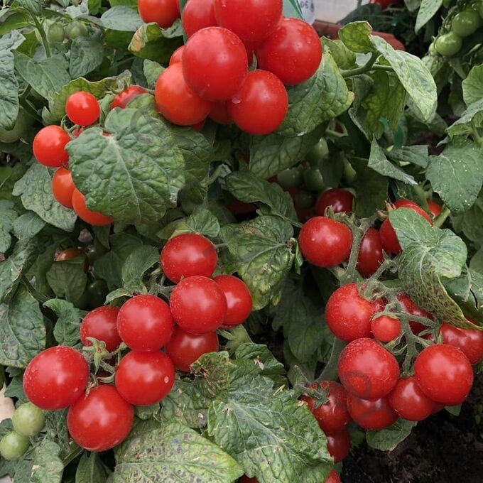 Удивительное растение. Отлично растёт и плодоносит в комнатных условиях, на грядках, в декоративных посадках и защищённом грунте. Растение детерминантное, штамбовое, плотное. Кусты высотой и диаметром 30-35см, что позволяет выращивать в загущенных посадках 7-8 растений/м2. На каждом кусте самостоятельно формируется 6-8 побегов, на которых образуется 15-20 кистей, в простых кистях 8-11 цветков, в полусложных от 18 до 25 цветков. Плоды одномерные, массой 10-12 г. Первые помидорчики созревают через 70-75 дней после появления первого листа. Плоды округлой формы, 2-х камерные, одномерные, образуют плотную кисть насыщенно красного цвета с красивым блеском.