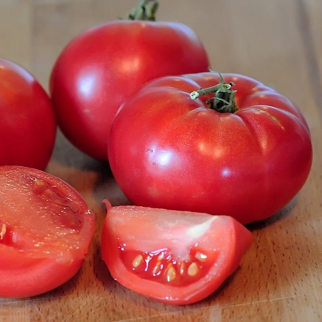 Родом из США. Раннеспелость, крупноплодность, дружность созревания=кистевой. Сорт индетерминантный (160-180 см). Пасынковать надо, рекомендую вести в один стебель, тогда созревание наступит раньше, плоды образуются крупнее, продувание воздуха между растениями выше. Сажать можно гуще, через 30-35 см, хоть в строчку, хоть шахматкой(речь о теплице не менее 6х3м), подвязывая верхушки хрошо бы направлять их чередуя, в разные стороны, чтобы свет падал и на стебли, тогда не будут так сильно вытягиваться междоузлия и кисти формируются, примерно, через 15 см. Среднеранний, в норме 105-110 дней от всходов до начала созревания. Стебли мощные и прочные, соцветия букетные, по 5-7 цветков в каждом, первые цветки формируются над 8-9 листом, в дальнейшем – через каждые 3 листа. Плоскоокруглая слабо ребристая форма, окраска неспелого плода – зеленая с небольшим темным пятном у плодоножки. Несмотря на крупноплодность, созревает дружно, красивыми кистями, спелые помидоры малинового цвета, чем спелее, тем насыщеннее цвет. Мясистая, многогнёздная мякоть; на кисти сохраняются хорошо, перезревают медленно. Единичные мелкие - поздно завязавшиеся, можно сразу удалять эти цветки. Масса – от 350 - 400 г и выше, насколько позволят погодные условия.
