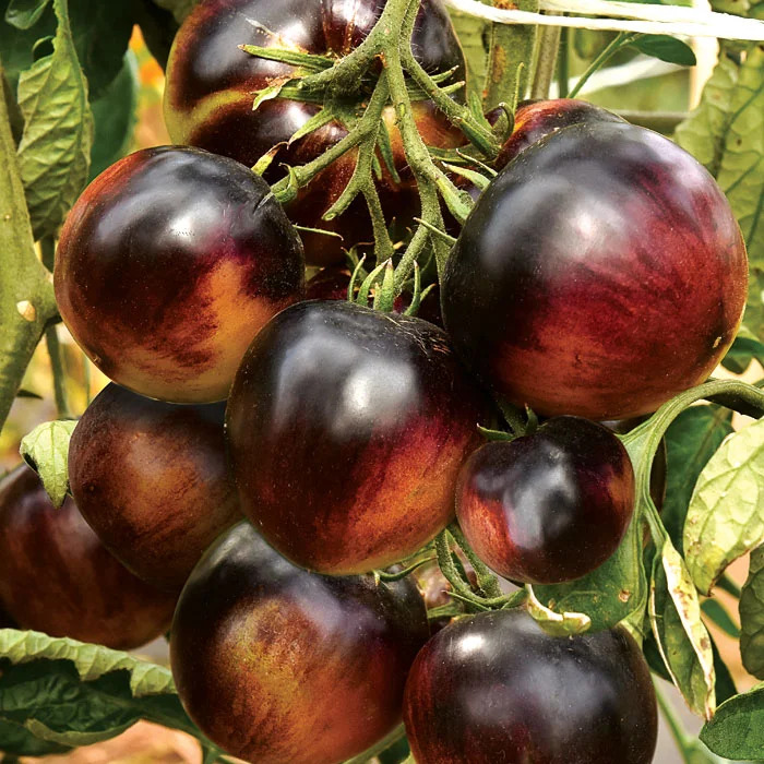 Единственный в своем роде, удивительный и неповторимый гибрид! Округлые кремовые плоды с ярким чернильно-фиолетовым пятном у плодоножки. Чем более жаркое лето, тем больше размеры пятна! Мякоть кремово-желтая с фиолетовыми вкраплениями, приятного сладкого вкуса. Томаты средней массой 150 г созревают в кистях по 4-7 шт., не растрескиваются.  Растения индетерминантного типа высотой до 2 м. Выращиваются с формированием в 2 стебля.