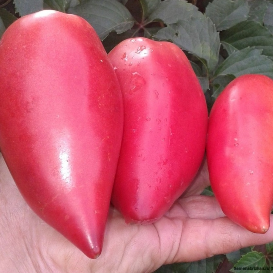 Среднеспелый кистевой сорт, отличающийся обильным плодоношением, бесподобно-сладким вкусом, отличной лежкостью и универсальностью томатов экзотической формы. Не сложен в культивации, может выращиваться в теплицах и открытом грунте (в коловой культуре). Растение индетерминантное, высотой до 2 м, обильно и часто завязывает плодовые кисти с 6-8 плодами средней массой 200 г. Плоды первых кистей особо крупные, могут достигать веса 400 г. Томаты перцевидные, с заостренной загнутой верхушкой. Мякоть плотная, малиновая, сахаристая. Кожица плотная, устойчива к растрескиванию, что позволяет долго хранить и прекрасно консервировать плоды. Растения болезнеустойчивы, обильно продолжительно плодоносят, обеспечивают высокие показатели потенциальной урожайности. С одного растения можно получить до 7 кг товарных томатов.