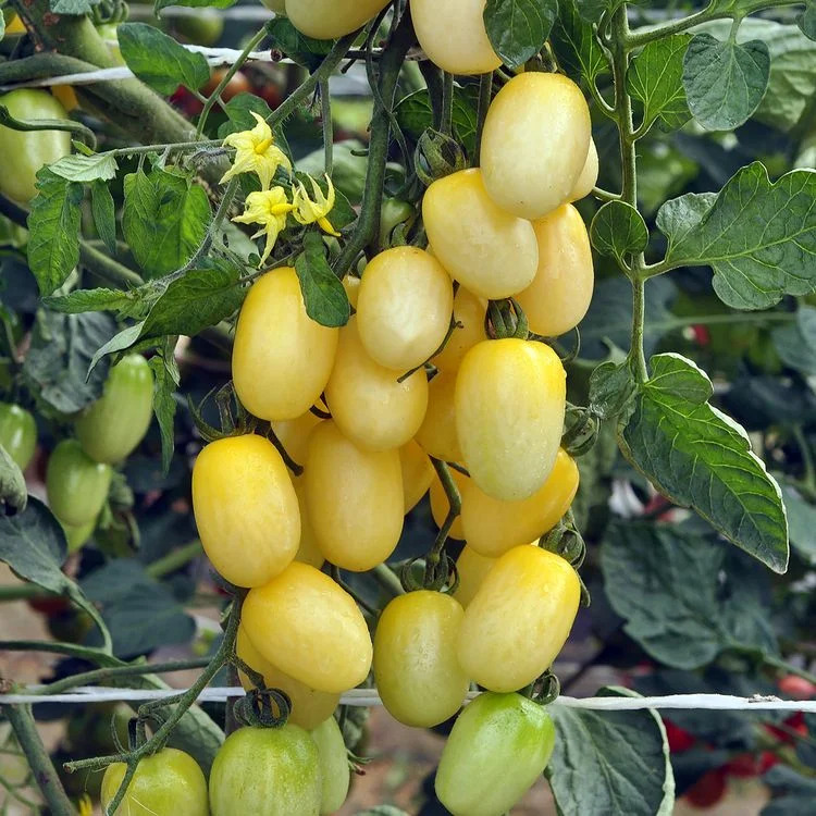 Эксклюзив в мире томатов! Нельзя не заметить в теплице декоративные томатные кисти из 15-20 овальных выравненных плодов массой 20-25 г, словно выточенных из белого оникса с янтарными прожилками! Вкус не менее удивителен: насыщенный и сладкий, с нотками экзотических фруктов. Индетерминантный гибрид с высотой растения 120-150 см и средними сроками созревания подходит для выращивания в открытом и закрытом грунте.