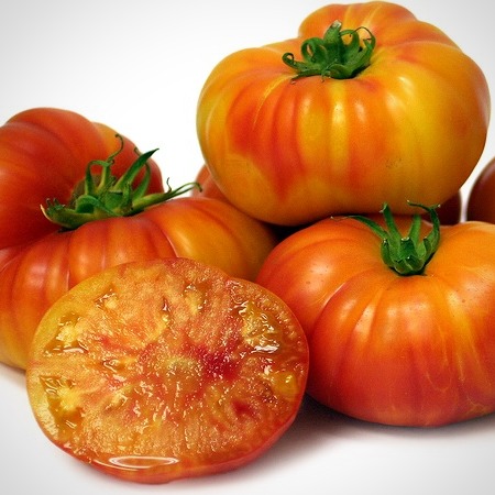Довольно редкий красивый и вкусный салатный томат триколор. Плоды довольно крупные, ярко-оранжевые с малиновыми пятнами румянца, на разрезе такие же многоцветные, очень мясистые. На вкус - фруктовый сахар!