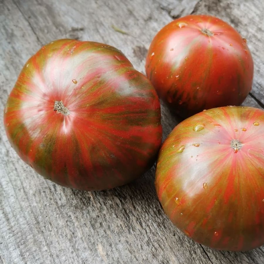 Сорт среднеспелый, в норме созревает через 105-115 дней. Детерминантный штамбовый тип куста с морщинистым простым листом, высотой около 120-130 см с отличной завязываемостью очень крупных плодов, плоскоокруглой формы, массой от 250 до 350 г, кожица тёмно-вишнёвого цвета в зелёную полоску. Плотные, сочные, вкус хорошо сбалансированный. Для свежего потребления и любых заготовок на зиму. Сорт относительно устойчив к заболеваниям. Посев в первой половине марта.