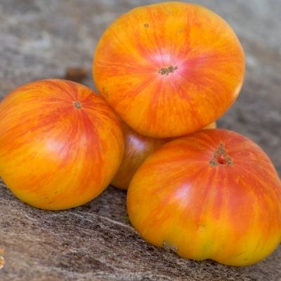 Детерминантный штамбовый куст в норме около 70 см; выше метра при избыточной влажности и загущённости. Лист крупный, морщинистый, простой. Среднеспелый, в норме созревает через 105-115 дней. Плоды крупные, плоскоокруглые, жёлто-оранжевые с розовыми полосками по всему плоду, с алым пятном на срезе, массой 200-300 г. Плоды не только красивые, но и мясистые, сочные, сладкие. Очень вкусные салаты, соки, соусы, а так же любые заготовки на зиму.