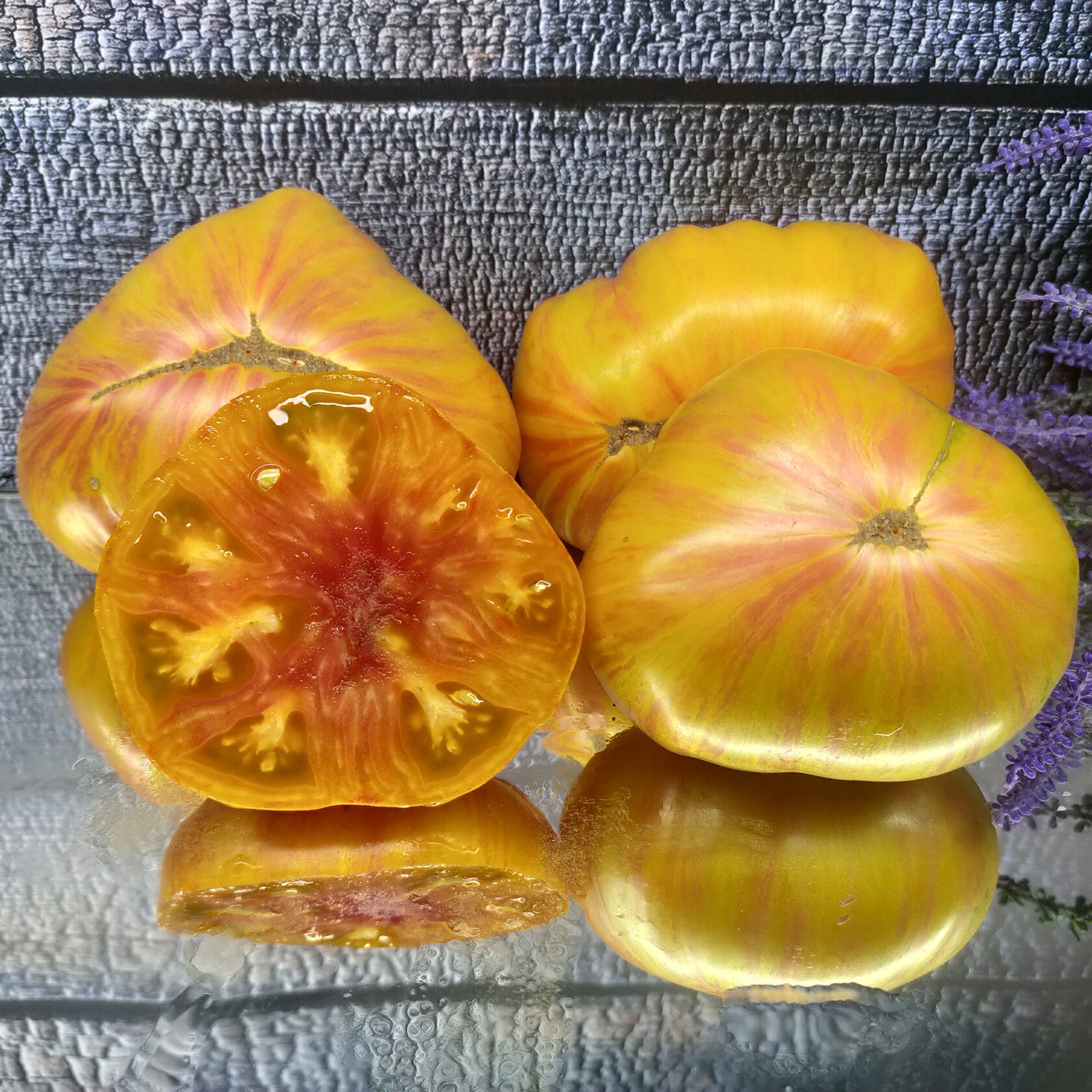Детерминантный штамбовый куст в норме около 70 см; выше метра при избыточной влажности и загущённости. Лист крупный, морщинистый, простой. Сорт среднеспелый, в норме созревает через 105-115 дней. Плоды крупные плоскоокруглые декоративные биколоры, жёлтые и жёлто-оранжевые с розовым румянцем, на поперечном срезе по центру красное солнышко, массой 200-300 г. Плоды не только красивые, но и сочные, сладкие, очень вкусные, ароматные! Салаты, соки - плоды пригодны для любых заготовок на зиму.
