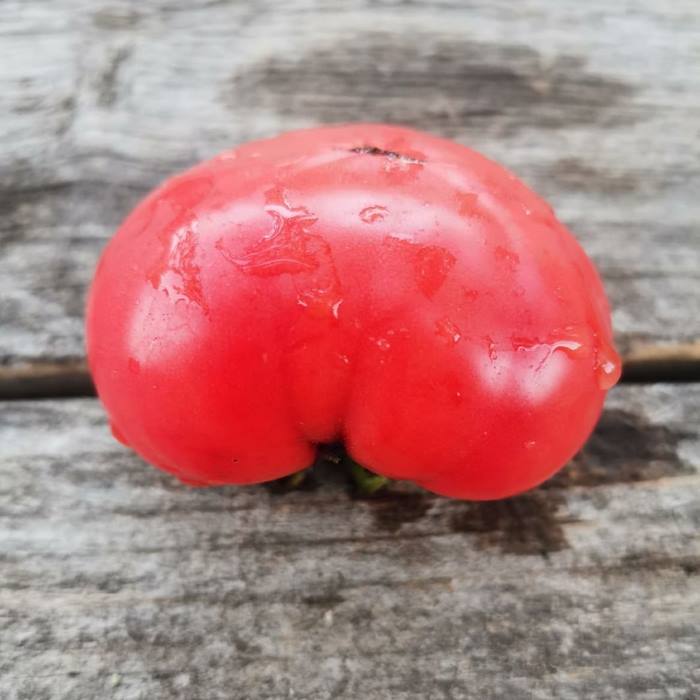 Среднеспелый (115 дней от всходов) карликовый детерминантный сорт томата из проекта «Томаты Гномы» (Open Dwarf Project). Растения до 120 см, с темно-зелеными, морщинистыми, обычными листьями и очень крепким центральным стеблем. Плоды плоскоокруглые, слаборебристые, массой 120-370 г, розового цвета, очень мясистые, сладкие. Вкус полный, очень приятный, хорошо сбалансированный. Сорт салатного назначения, обладает хорошей урожайностью.