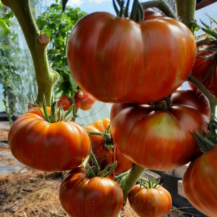 Сорт среднеспелый, в норме созревает через 105-115 дней, завязываемость высокая, отсюда урожайность! Детерминантный куст высотой  от 100 до 130 см. Лист крупный, морщинистый, простой. Незрелые плоды в штрихах и полосках, у зрелых - кожица красного цвета в жёлто-зелёную полоску, массой 200-300 г, мякоть плотная, сладковатая, ароматная. Очень вкусные салаты, соки, а так же любые заготовки на зиму.