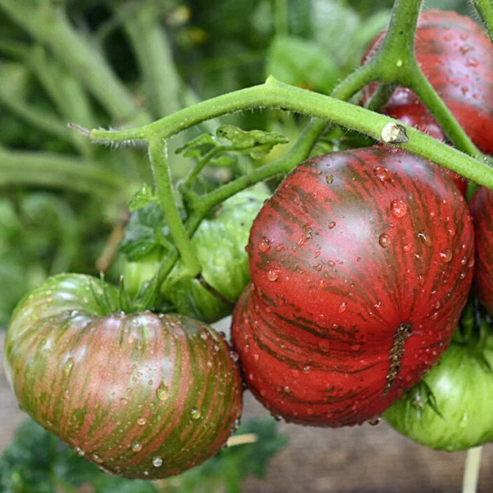 Среднеспелый (срок созревания 110-120 дней), среднерослый (высота куста 80-120 см) сорт из серии томатов-гномов. Плоды имеют крупную, плоскоокруглую форму. На этапе вызревания окрас помидор бывает тёмно-оливковый, почти фиолетовый. Спелые томаты имеют розовато-пурпурный цвет с зелёными полосками. Каждый плод весом от 150 до 250 г. Если разрезать плод, то на срезе видна тёмно-вишневая мякоть. На вкус томаты сахаристые, наливные и толстомясые. Можно почувствовать вкус пряностей и ароматный запах. Этот сорт отличается хорошей транспортабельностью, степень хранения оценивается по высокому классу. Урожайный сорт, с куста можно собрать около 3 кг помидор. Из-за высокой урожайности требуется подвязка растений к шпалере, и следует проводить частичное пасынкование. Отличная урожайность наблюдается при формировании куста в 2-3 стебля.