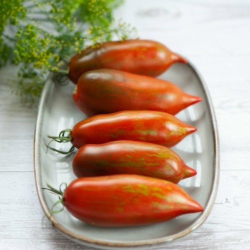 Куст компактный, до 50 см в открытом грунте и до 90-100 см в теплице. Плоды удлинённые (10-15 см), с «носиком», весом 60-120 г. В зрелости окраска насыщенная: шоколадно-красная с жёлто-зелёными или бронзово-золотистыми полосами. Кожица устойчива к трещинам, мякоть плотная, мясистая, хорошо хранится и транспортируется. Вкус сбалансированный, с лёгкой кислинкой и пряными нотами. Подходит для салатов и домашней переработки: консервации, соусов, пасты и соков. Растение простое в уходе, подходит для выращивания без пасынкования. Рекомендуется удалять нижние листья для вентиляции и профилактики болезней. Отличный выбор для тех, кто предпочитает простоту, эстетику и надежную урожайность. Подходит для выращивания в теплицах и в открытом грунте.