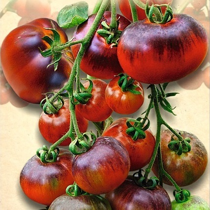 Очень необычный томат, сочетающий в себе достоинства целебных сортов с высоким содержанием антоцианов и "шоколадноплодных" сортов. Необычная окраской плодов – в технической спелости зеленый с фиолетовыми “плечиками”, в биологической шоколадный с фиолетовыми плечиками. Очень интенсивный “помидорный” вкус и аромат. Среднеспелый сорт – 110-120 дней от всходов до плодоношения, индетерминантный, мощный, быстро развивающийся. Многочисленные крупные плоды до 250 грамм. Кисть сложная, разветвленная, состоящая из 6-8 плодов. Плоды круглые и плоскоокруглые, массой до 250 г, в биологической спелости шоколадно-коричневые с большими фиолетовыми “плечиками”, занимающими половину плода. Мякоть очень нежная, сладкая. Назначение десертное.