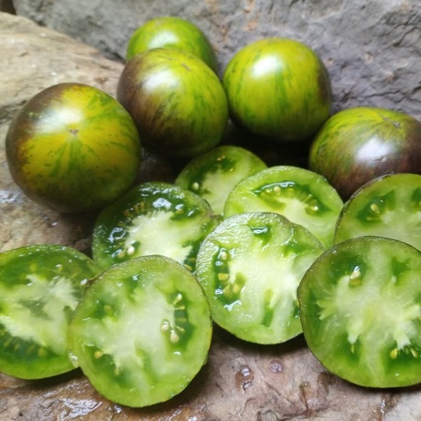 Космическая новинка от Брэда Гейтса (США). Синие плечики и пестрый зелено-желтый низ, великолепный вкус и высокая урожайность, лежкость и выносливость - 5 в 1 ! Среднеспелый, индетерминантный сорт в котором все прекрасно - внешний вид, вкус, урожайность, длительность хранения, неприхотливость. В высоту не превышает 180 см при формировании в 2 стебля. Плоды 80-120гр, круглые, плотные, как и все зеленоплодные сорта, имеют гелевую структуру мякоти и очень сладкий вкус. Не прихотлив в выращивании. У неопытных огородников могут возникнуть проблемы с определением спелости этого сорта - ориентируетесь на "мягкость" плодов. Впрочем если вы собрали зеленоватый урожай, томаты прекрасно полежат и доспеют, не потеряв при этом сладость.