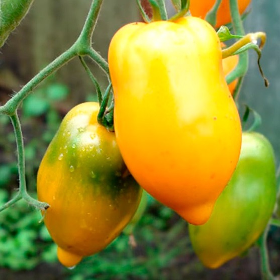 Среднеспелый сорт – 110-120 дней от всходов до плодоношения, индетерминантный, высокорослый, быстро развивающееся. Необычный томат как по форме, так и по вкусу – настоящий тропический фрукт. Ярко-оранжевый, без сока – полностью заполнен мякотью, почти без семян. Неповторимый вкус и аромат. Характерные длинные, поникающие листья. Кисть простая, состоящая из 5-7 плодов. Плоды – точная копия манго сорта Синдри – вытянуто-овальные с небольшим носиком, блестящие, массой до 250-260 г, в биологической спелости желто-оранжевые. Мякоть оранжевого цвета, очень нежная, сладкая. Семенных камер практически нет – весь плод сплошная сахаристая мякоть. Назначение десертное.