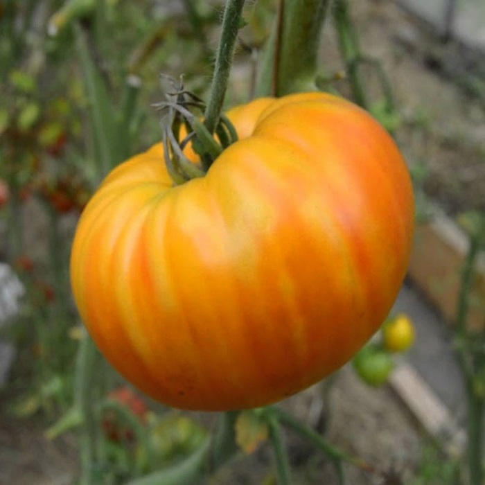 Среднеспелый (115 дней) индетерминантный крупноплодный сорт. Стал одним из любимых биколоров у многих садоводов из-за его красоты, размера и вкуса. Плоды мясистые, малосемянные, очень сладкие, сочные, массой около 400г (до 800г), желто-оранжевой окраски с рубиново-красными прожилками, обладают восхитительно фруктовым вкусом. Сорт обладает хорошей урожайностью, рекомендуется для свежего потребления.