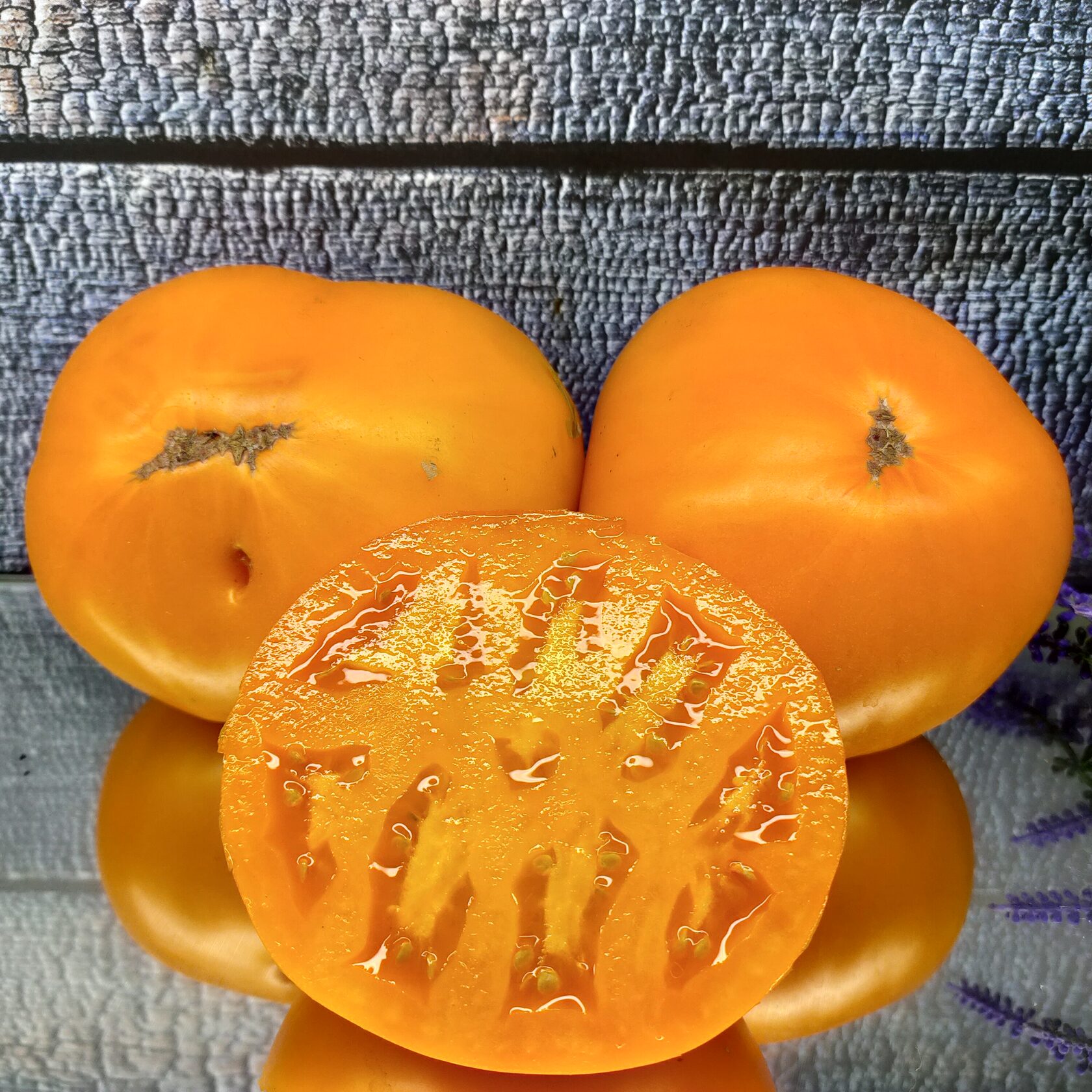 Настоящий экзотический фрукт, массой от 200 до 450 г. Это среднеспелый индетерминантный (высота куста 1,8-2 м,) сорт. Куст не агрессивный, листья простые, слегка поникшие. Плоды плоскоокруглые, оранжево-жёлтые с золотистыми лучиками от вершинки, превосходного медового вкуса, сочные, сладкие. Мякоть маслянистая, нежная, семян мало. Этот томат ценится за высокую урожайность и отличные вкусовые качества. Из плодов этого сорта получаются вкусные соки, пюре и пасты. Для засолки и маринадов он тонкокож. Великолепен для приготовления салатов.