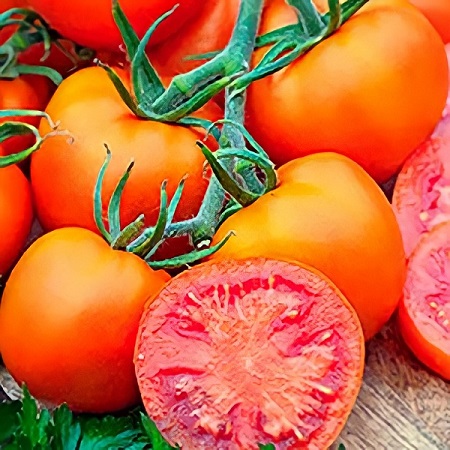 Необычный раннеспелый сорт c оранжевой кожицей и красной мякотью. Первый урожай собирают на 105-110 день после всходов. В средней полосе рекомендуется для пленочных укрытий, в южных регионах – для открытого грунта. Растения индетерминантные, высотой 1,6-1,8 м. Первое соцветие закладывается над 6-7 листом, последующие – через 1-2 листа. Плоды массой около 90 г На вкус они сладкие, сочные, с приятным ароматом. Томаты прекрасно подходят для салатов и украшения блюд, для цельноплодного консервирования. После сбора хранятся продолжительное время. Сорт устойчив к основным болезням культуры. Урожайность – свыше 8 кг/м 2.