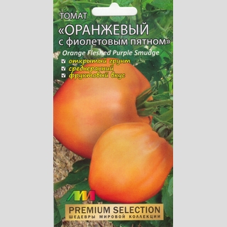 Оранжевый с фиолетовыми пятнами (Orange Fleshed Purple Smudge) США – Крупноплодный бифштексный томат с мякотью оранжевого цвета и минимумом семян, масса до 300 гр. Первые урожаи снимают через 124–126 суток после всходов. Сладкий, с нежной мякотью. Плоды сверху окрашены антоцианом, одним из лучших антиоксидантов. Высокорослый среднеспелый сорт. Высота растения — 1,7–1,9 м (в открытом грунте 1,0-1,3 м). Сорт Оранжевый с фиолетовыми пятнами приносит до 4–6 кг товарных помидоров с одного куста.