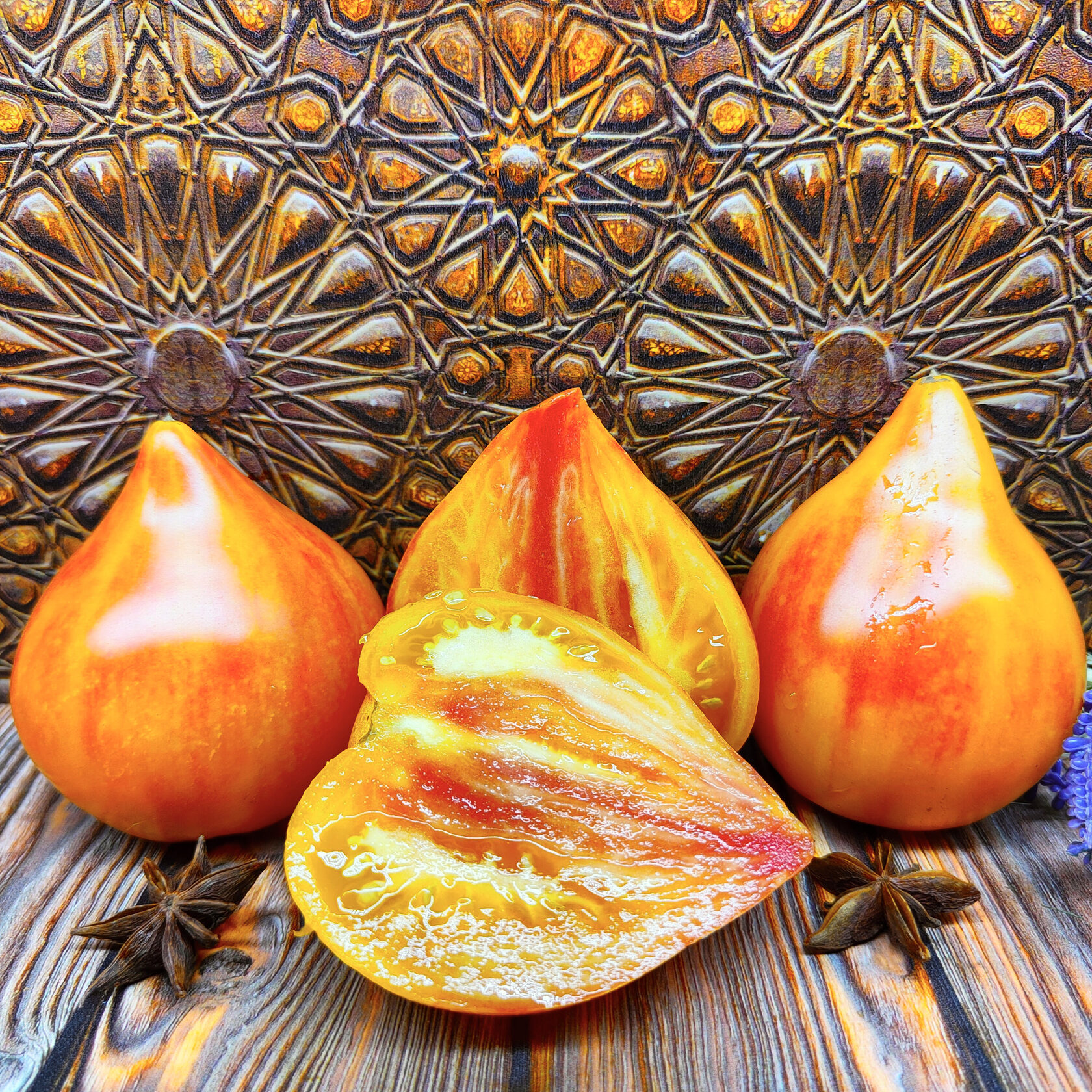 Коллекционный крупноплодный среднеспелый салатный сорт. Растение высотой до 1,8 м, индетерминантное. Плоды массой 200-400 г не только вкусны, но и очень красивы. Сердцевидные, чуть вытянутые, с характерным «носиком». Очень яркие: оранжево-жёлтые со светящимися розово-алыми вертикальными полосами. Мякоть сочная и плотная, на разрезе оранжевая с красно-розовыми разводами. Настоящий «живой мрамор»! Вкус отличный, деликатесный! Действительно сладкий, сбалансированный, с лёгкой кислинкой и нежным фруктовым послевкусием.