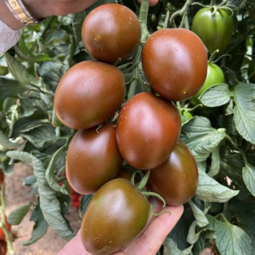 Томат Пасхальное Яйцо F1 - среднеранний индетерминантный гибрид для выращивания во всех типах теплиц. От всходов до созревания 100-105 дней. Растение генеративного типа, с укороченными междоузлиями. Первая кисть закладывается над 7-9 листом. В кисти образуется 7-9 плодов. Плод яйцевидной формы, насыщенно-коричневого цвета, массой 120-130 г, плотный и лежкий. Отличается хорошей завязываемостью плодов. Вкусовые качества плодов отличные, плоды имеют повышенное содержание ликопина. Устойчив к вирусу томатной мозаики (ToMV), вирусу желтого скручивания листьев (TYLCV), вирусу бронзовости (TSWV), фузариозному (Fol 1-2) и вертициллёзному увяданию (Va, Vd) и нематодам (Ma, Mi). Схема посадки 70х40 см. Урожайность свыше 22 кг/м2.