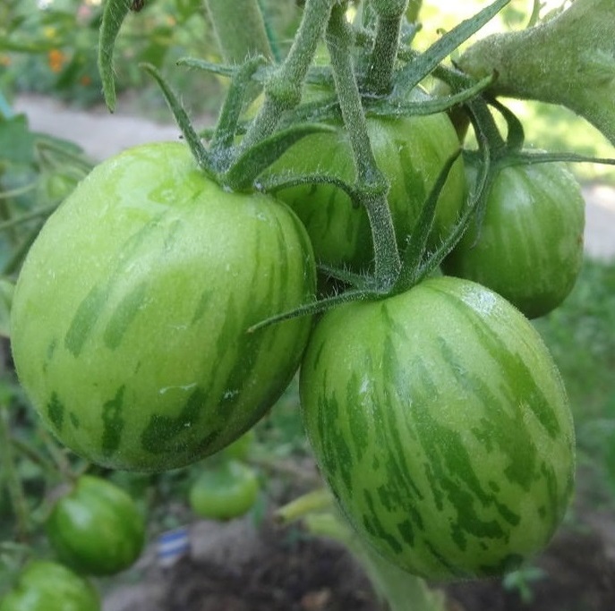 Экзотический сладкий зеленый. Сибирский экзотический зеленоплодный сорт. Плоды необычные, зеленовато-желтые с малахитовыми штрихами, напоминают пестро-окрашенные перепелиные яйца. Растение высотой до 1,8м. Часто завязывает обильные кисти с 5-7 пестрыми яйцевидными плодами с маленьким носиком, массой 50-70 грамм.