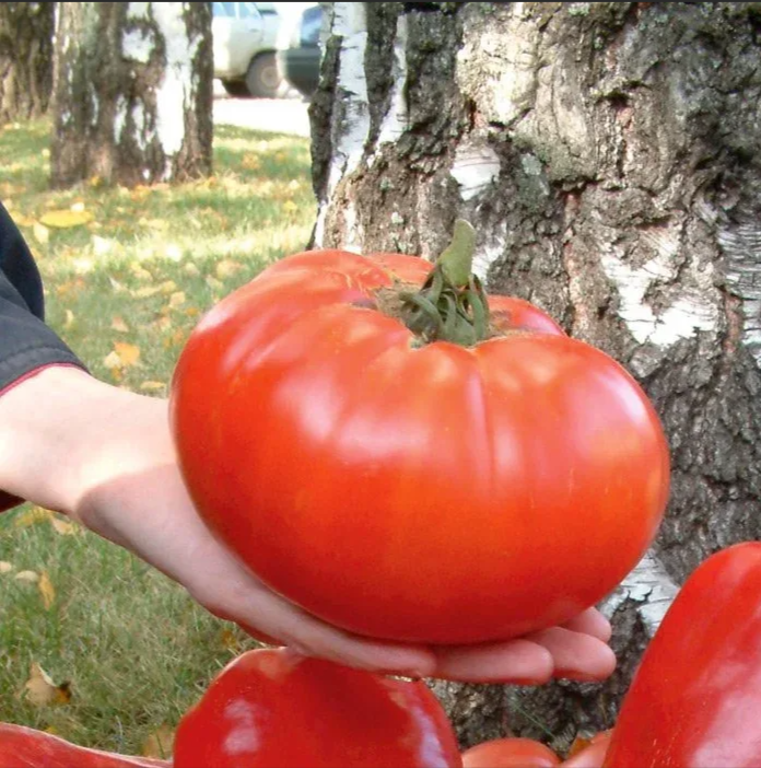 Плод ярко-красный, плоско-округлый, многокамерный. Мякоть мясистая, сочная, с повышенным содержанием сахаров, обладает изумительным вкусом. При соответствующем уходе и нормировании количества завязей в кисти можно вырастить рекордные плоды до 2 кг! Растение сильнорослое, индетерминантное. Урожай через 130 -140 дней.