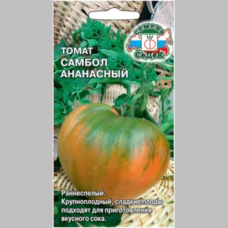 Раннеспелый (105-110дней) сорт для парников и теплиц. Растение индетерминантное, среднеоблиственное, высотой до 1,5-1,7 м. В кисти формирует 4-5 плодов с необычной экзотической окраской. Плоды плоскоокруглые ребристые, крупные, массой 400-600 г, зеленоватые, с розово-коричневым оттенком, пестрые, напоминающие по цвету настоящие ананасы. Мякоть сочная, практически без семян. Сахаристость довольно высокая, это делает их сладкими, без выраженной кислинки. Урожайность составляет 8-9 кг/м2.