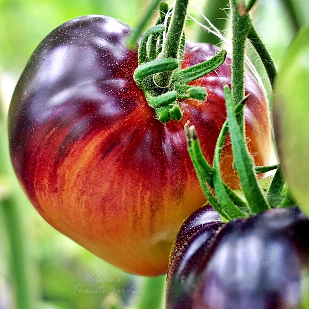 Кирпично-красная версия известного сорта (расщепление). Срок созревания составляет 110-120 дней. Индетерминантный сорт, который в открытом грунте достигает высоты 1,5 м. Плоды формируются кистями по 5-6 штук. Помидоры имеют плоско-округлую форму и крупные размеры, в среднем от 200 до 300 г. Их окраска привлекает внимание: снаружи они оранжево-красно-бронзовые, с тёмным антоцианом на плечиках, а внутри - красная мякоть. Кожица плотная и гладкая. Мякоть сладкая и обладает насыщенным ароматом. Вкус сравнивают с карамелью, он отличается отличным балансом кислоты и сладости. Этот сорт можно выращивать как в теплице, так и в открытом грунте. В теплице урожайность будет заметно выше. Кожица помидоров не склонна к растрескиванию. Для успешного выращивания этому сорту необходимо много солнца, под его воздействием антоциан активно темнеет.