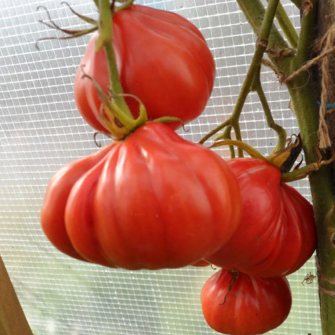 Среднеспелый сорт – 110-115 дней от всходов до плодоношения. Детерминантный, высокорослый, растение крупное, быстроразвивающееся. Кость сложная, разветвленная, состоящая из 6-7 цветков. На первой кисти, как правило, 3-4 плода – самые крупные. Плоды необычной формы, состоят из хинкали, с ярко выраженной гармошкой из ребера, крупные, массой до 300 г, ярко-малинового цвета, блестящие, плотные. Очень вкусные, практически без кислинки. Назначение десертное.