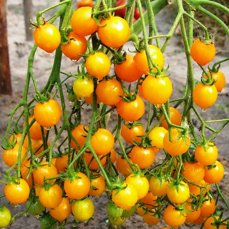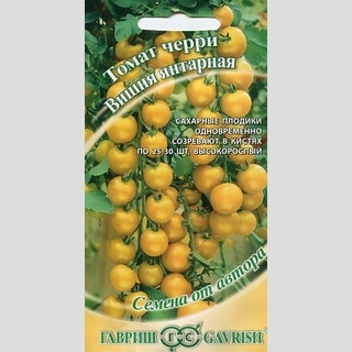 Сахарные плоды-вишни — лучшее украшение фуршетных и праздничных столов, легкое, а главное очень вкусное угощенье для детей и взрослых. Раннеспелый сорт. Длинные кисти с 25-30 плодами одновременно созревают через 95-100 дней после появления всходов. Растение индетерминантное (с неограниченным ростом), высокорослое, высотой 2 м. Рекомендуется для выращивания в открытом грунте (с подвязкой к кольям) или пленочных теплицах. Плоды сочные, очень сладкие, янтарно-желтого, массой 20 г. Прекрасно подойдут для употребления в свежем виде и приготовления яркого аппетитного консервированного ассорти с сортами Вишня красная, Вишня желтая и Вишня розовая.