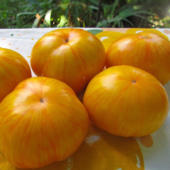Сорт индетерминантный, вести в 2-3 стебля, прищипнуть верхушку в начале августа, в открытый грунт после завязи 3-х кистей на каждом стебле. Плоскоокруглый плод массой до 450 г поначалу в зеленую полоску, затем вызревает в ярко-желтого красавца, который на срезе имеет солнечную мякоть, ароматную, сочную, сладкую с цитрусовым оттенком, этакая огромная "отбивная". Плоды пригодны для любых видов заготовок. Посев на рассаду в первой декаде марта. Семена советую не замачивать более чем на 20-30 минут проращивать на среднеотжатых ватных дисках в пакетах, чтобы не пересыхали, при t 28-30°С и далее проростки перемещать в грунт.