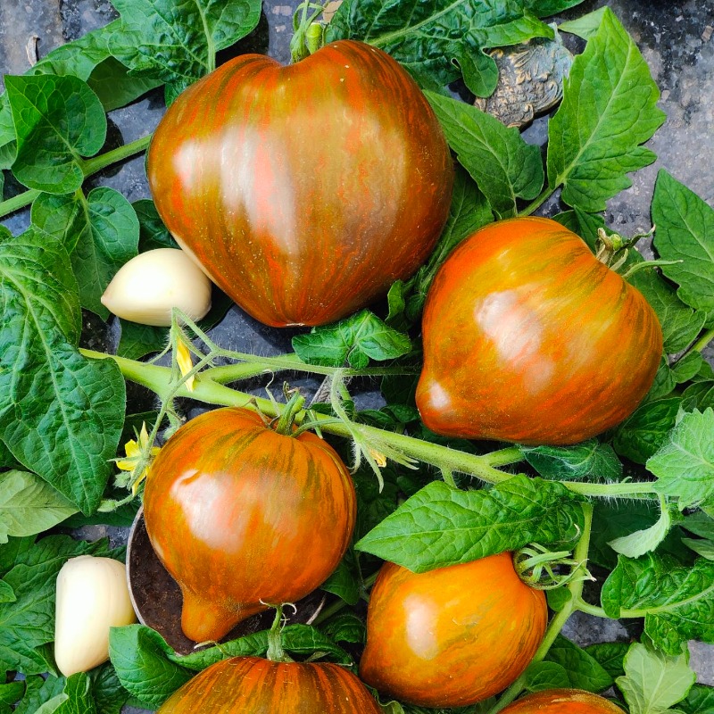 Индетерминантное, высокорослое растение, достигающее примерно двух метров в высоту. Этот среднеспелый сорт отличается от других сердцевидных сортов своими пониклыми, прижатыми листьями. Формируется в два-три стебля и требует обязательной подвязки. На одной кисти может быть от пяти до семи плодов сердцевидной формы. Когда плоды полностью созревают, они приобретают тёмно-красно-оранжевый цвет с зелёными полосками и штрихами. Вес плодов варьируется от 150 до 350 г. Вкус плодов сладкий с лёгкой терпкостью. Они универсальны в использовании. Этот сорт обладает высокой болезнеустойчивостью и отличается хорошей урожайностью. Это действительно экзотическое растение!
