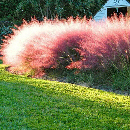 Злак экзотический с пурпурно-розовым облаком похожих на распущенные волосы соцветий. Стройный зелёный стебель, игольчатые глянцевые листья. Максимальная декоративность с конца лета до морозов, когда в саду уже мало цветов.