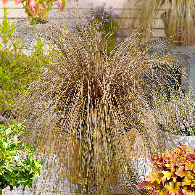 Буланой, желтовато-песочной, или светло-гнедой масти. Куст пышный, поникающий с жёсткими и тонкими бронзовыми листьями, которые ни в коем случае не срезают. Высота растения до 40 см и более.