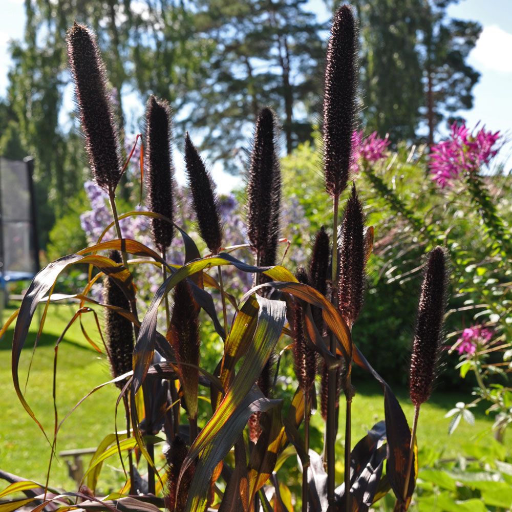 Исключительно декоративный злак. Кусты прямостоячие, с многочисленными стеблями и длинными листьями. Молодые растения зеленые, с возрастом проявляется и усиливается бордово-фиолетовый оттенок, особенно на ярком солнце. Соцветия колосовидные, прямые, длиной до 40 см, плотные, пурпурно-шоколадного цвета. Используют для одиночных посадок, в миксбордерах и в качестве живой изгороди, подходит для букетов, в том числе зимних.