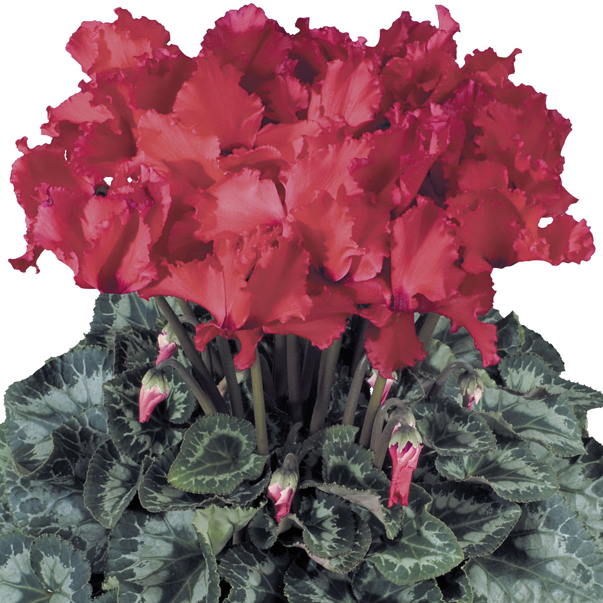 Цикламены серии «F1 Гелиос» творение знаменитого селекционера Шарля Мореля. Бахромчатые, крупноцветковые, обильноцветущие растения, образующие роскошный “букет” над манжеткой расписных листьев. Каждый цветок держится на растении до трех недель. Рекомендуемые сроки цветения в нашей зоне с октября по март. Растения очень быстро развиваются и вступают в пору декоративности на 2-3 недели раньше других крупноцветковых сортов.