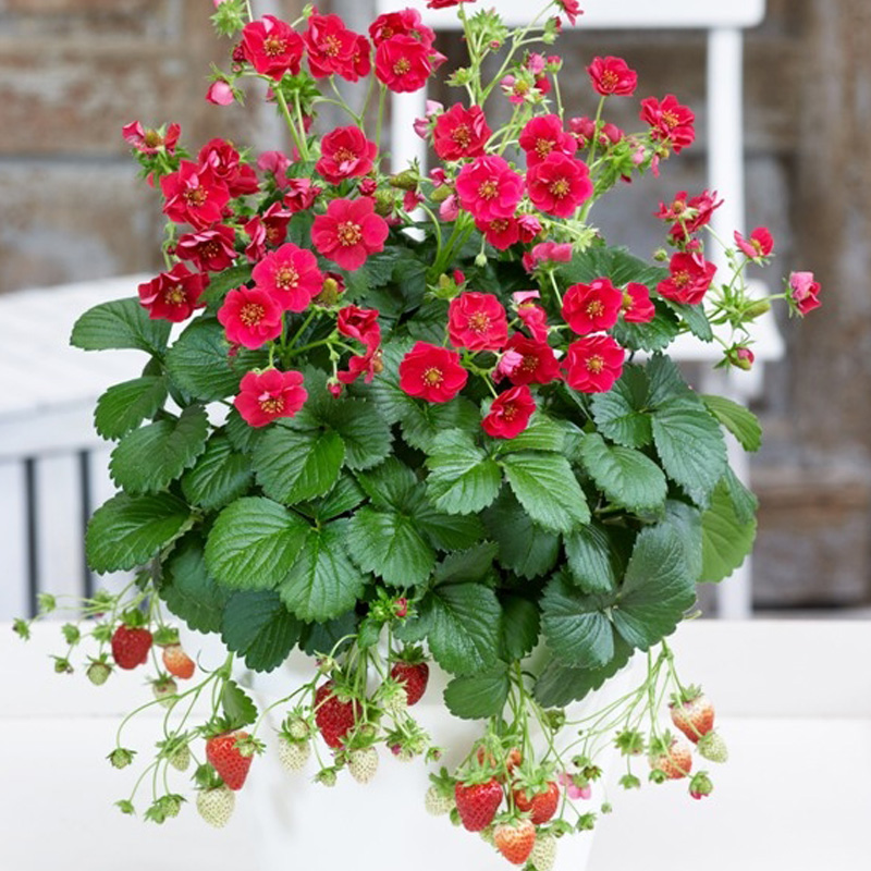Восхитительная, необыкновенная клубника с крупными, алыми цветками похожими на маленькие розочки, плодоносит весь сезон и служит ярким декоративным украшением любого садового участка, беседки, террасы, балкона или как комнатное растение. Растение компактное, ампельного типа, образует большое количество высоких цветоносов (до 40 см), развивает очень мало усов. Ягоды конической формы, ярко- красного цвета, среднего размера очень сладкие, сочные, вкусные, ароматные. Масса 20 г. Не любит яркого солнца для высадки выбирают слегка затененные места с почвой обогащенной органическими и минеральными удобрениями.